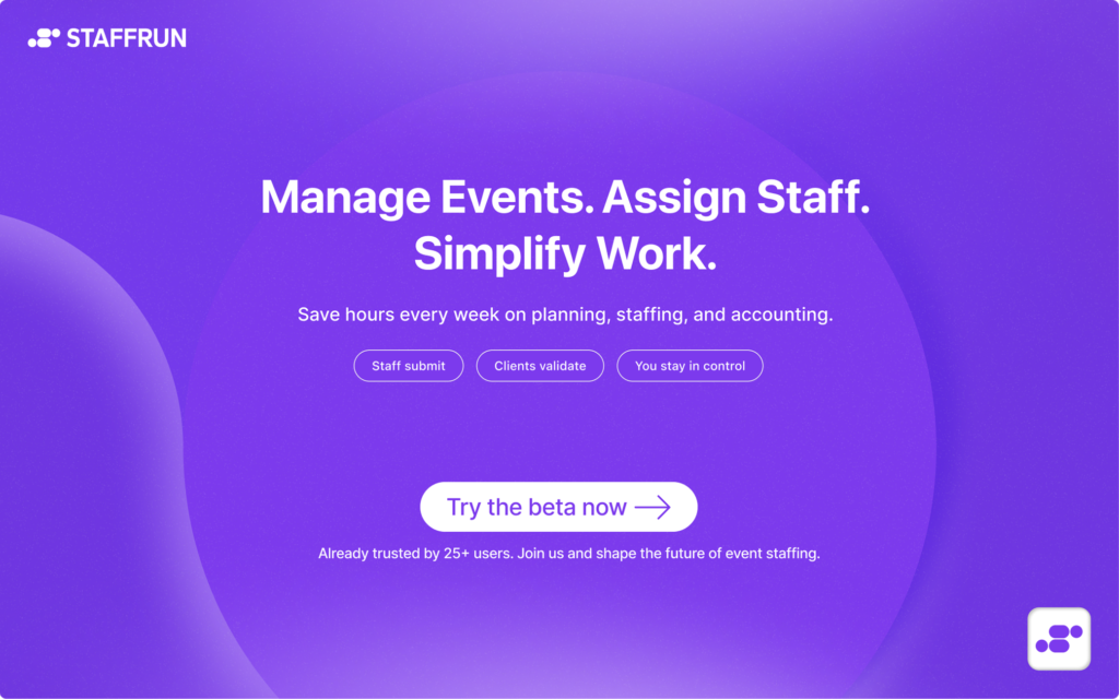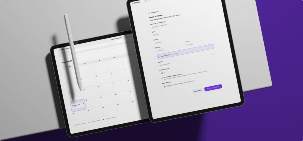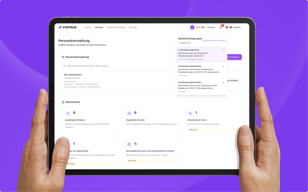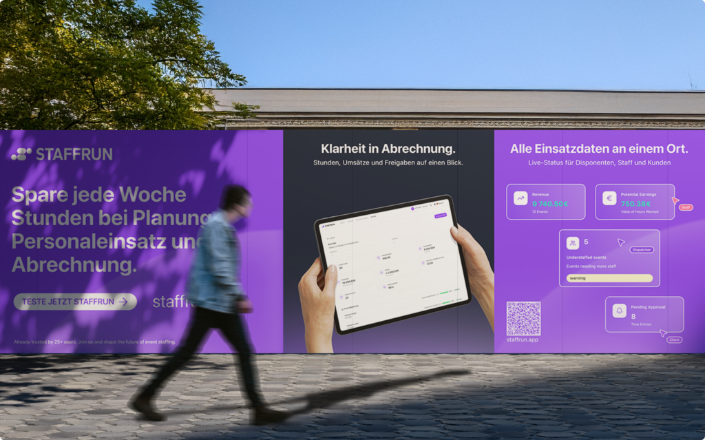 STAFFRUN bündelt Einsatzplanung, Zeiterfassung und Freigaben in einer zentralen Web-App.Für klare Abläufe, volle Transparenz und weniger administrativen Aufwand im Eventbetrieb.